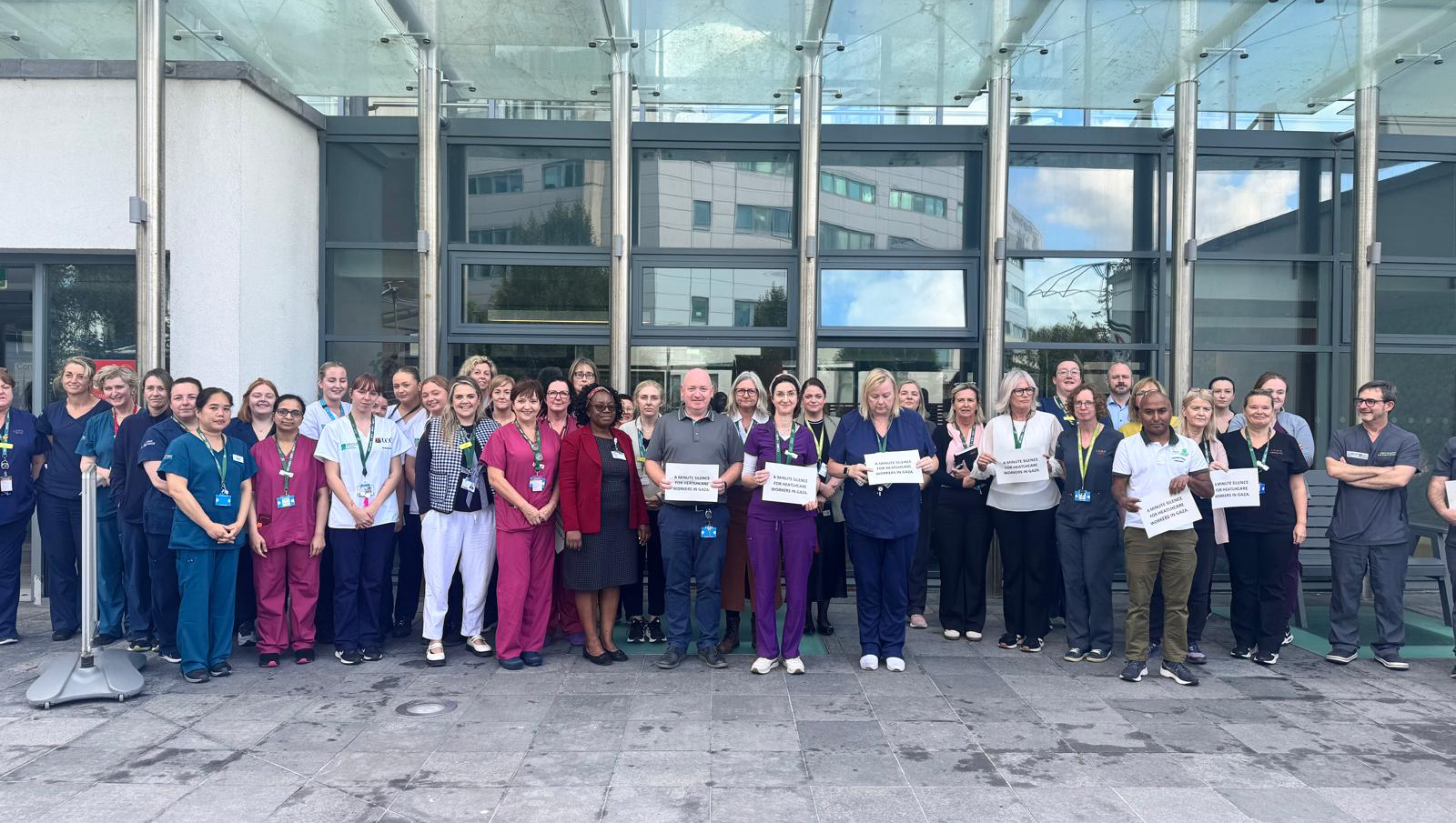 On the 23rd September, many HSE healthcare workers held a minute’s silence in solidarity with healthcare workers who have been killed in Gaza as well as those continuing to deliver healthcare in very challenging circumstances. Pictured are healthcare staff outside the CUMH.