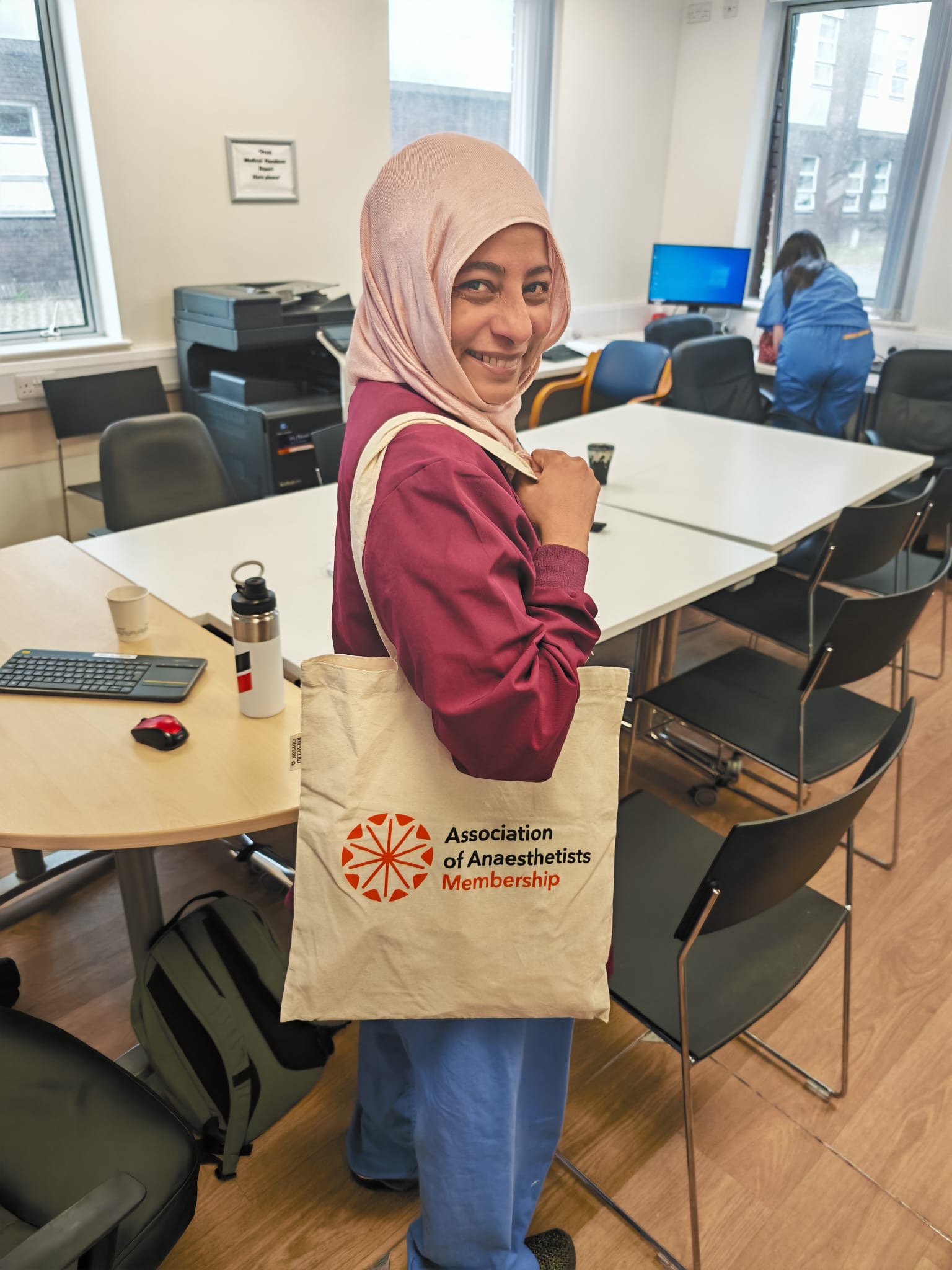 Dr Alan Horan (Consultant Anaesthesiologist, CUH) is the new regional lead for the Association of Anaesthetists, who kindly provided complementary tote bags, pens and lanyards to the Department of Anaesthesia, CUH- beautifully modelled by Dr Ciaran Sheehan, Dr Dylan Gouveia (above) and Dr Qurratulain Saquib (below).