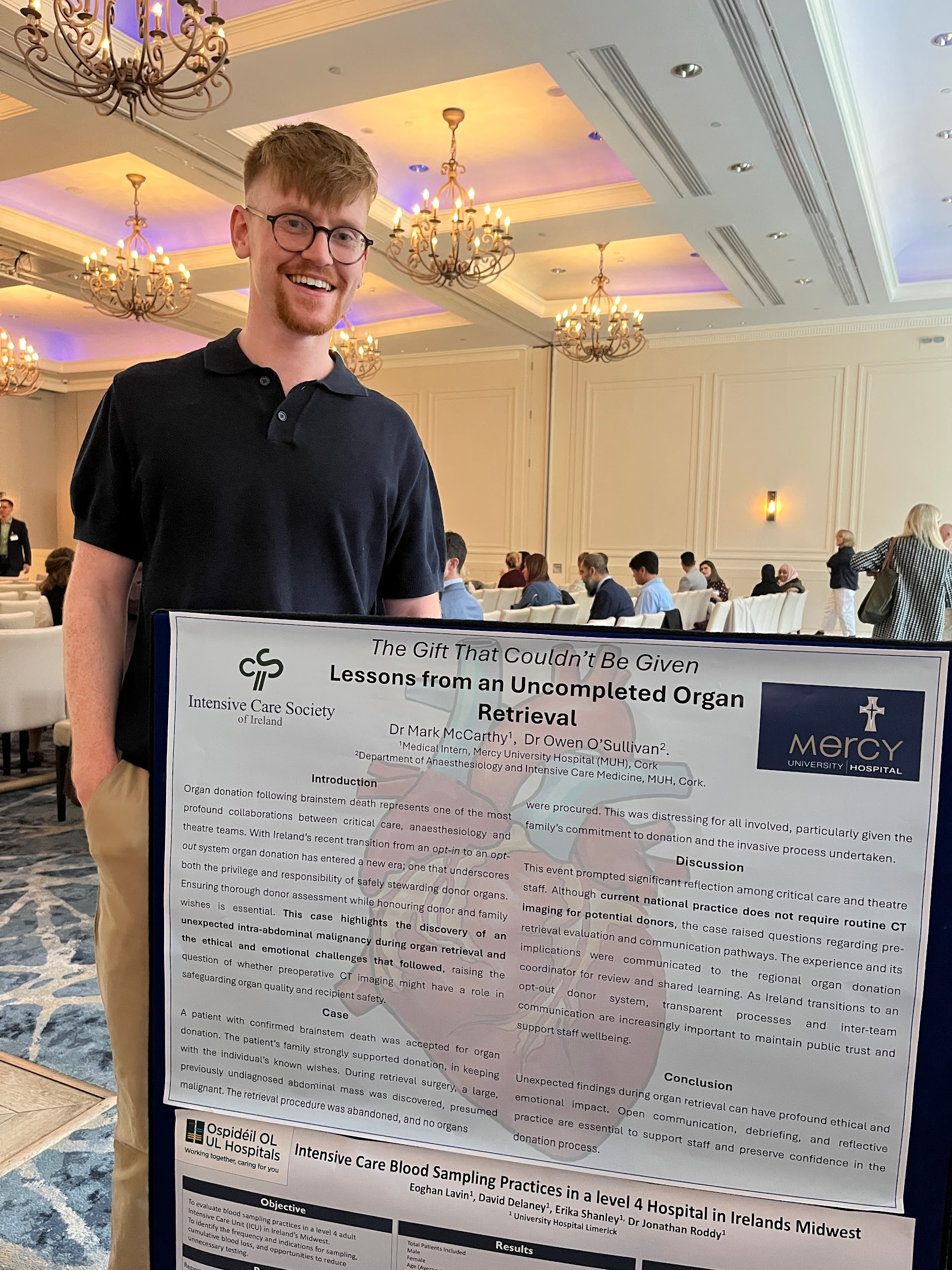 Photo: Dr Mark McCarthy next to his poster at this year’s Intensive Care Society of Ireland (ICSI) Conference, “The Gift That Couldn’t Be Given: Lessons from an Uncompleted Organ Retrieval”, which he conducted with Dr Owen O’Sullivan (Consultant Anaesthetist, MUH).