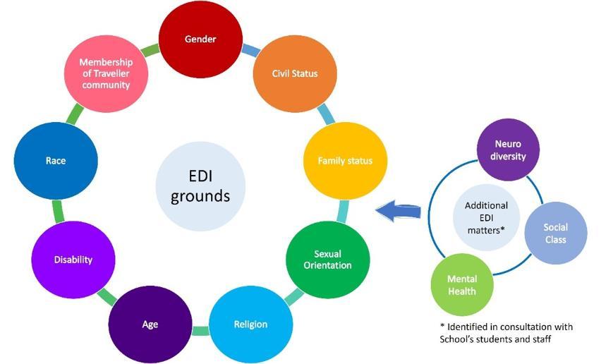 | Advancing awareness and encouraging discussion about equality, diversity and inclusion related to the different grounds established through EDI regulation, in addition to issues identified specifically in our School (see diagram below). |