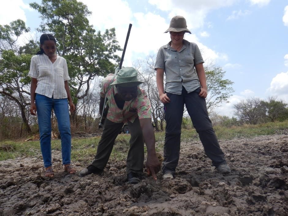 ILUMA Village Game Scout Mzee Kimboga points out a Warthog footprint at a dry season water hole, in amongst many others left by African Buffalo, to students Maureen Daffa from the College of Forestry, Wildlife and Tourism at Sokoine University of Agriculture (Left) and Lily Duggan from the UCC School of Biological, Earth and Environmental Sciences (Right).