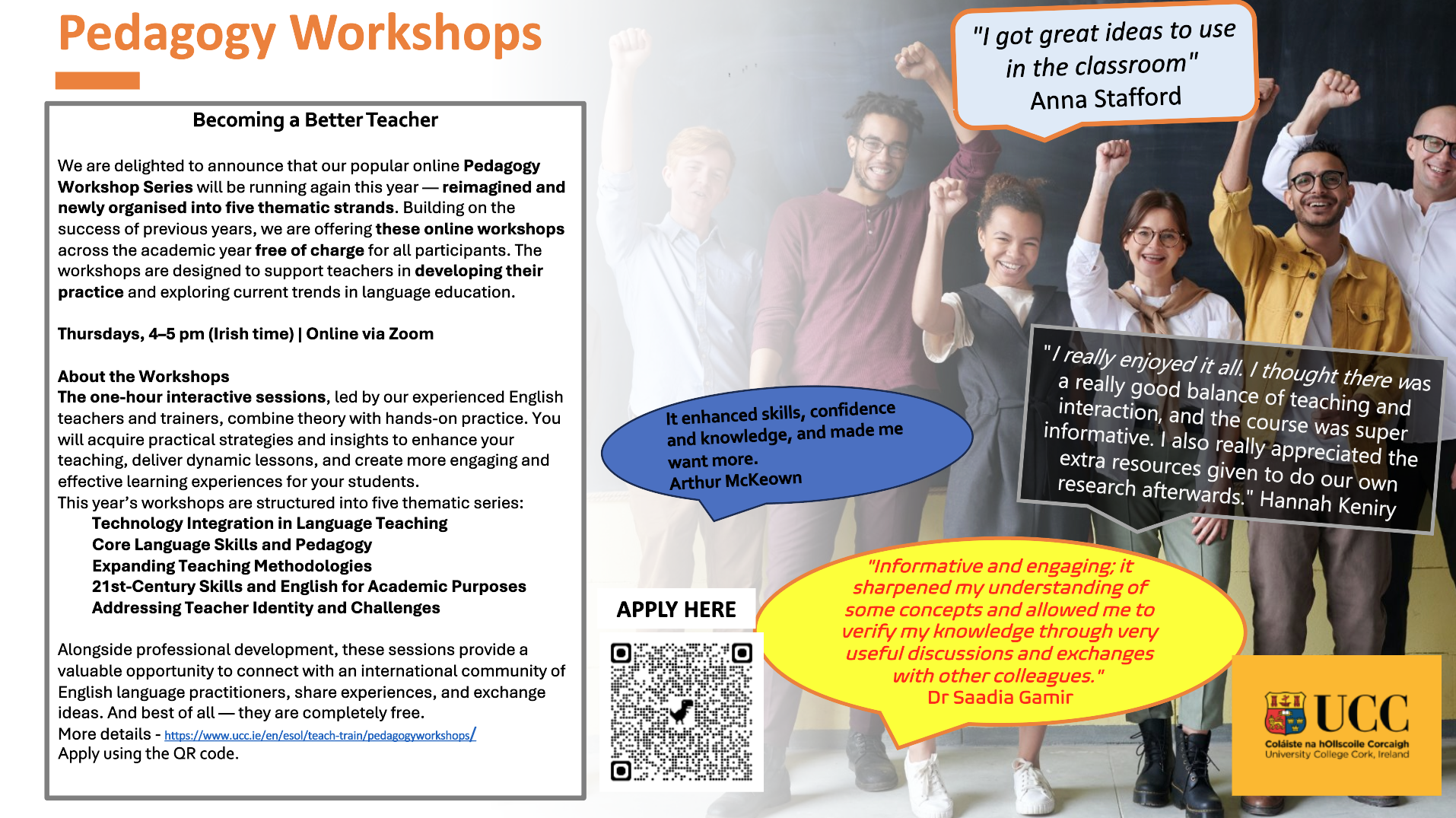 We are delighted to announce that our popular online Pedagogy Workshop Series will be running again this year — reimagined and newly organised into five thematic strands. Building on the success of previous years, we are offering these online workshops across the academic year free of charge for all participants. The workshops are designed to support teachers in developing their practice and exploring current trends in language education.