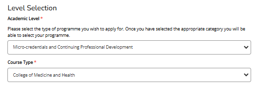 In the Academic Level tab select the options below and then the programme you're applying for.