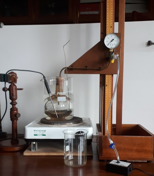 The apparatus for the experiment is shown above. A temperature sensor and gas sensor are placed inside the glass bulb to measure the pressure and temperature of the gas. Since the glass bulb cannot expand the volume is fixed. The bulb is placed in ice and allowed to cool for a time. When the temperature in the bulb drops the heater is turned on and as the temperature in the bulb rises the temperaure and pressure values ar etaken and graphed.