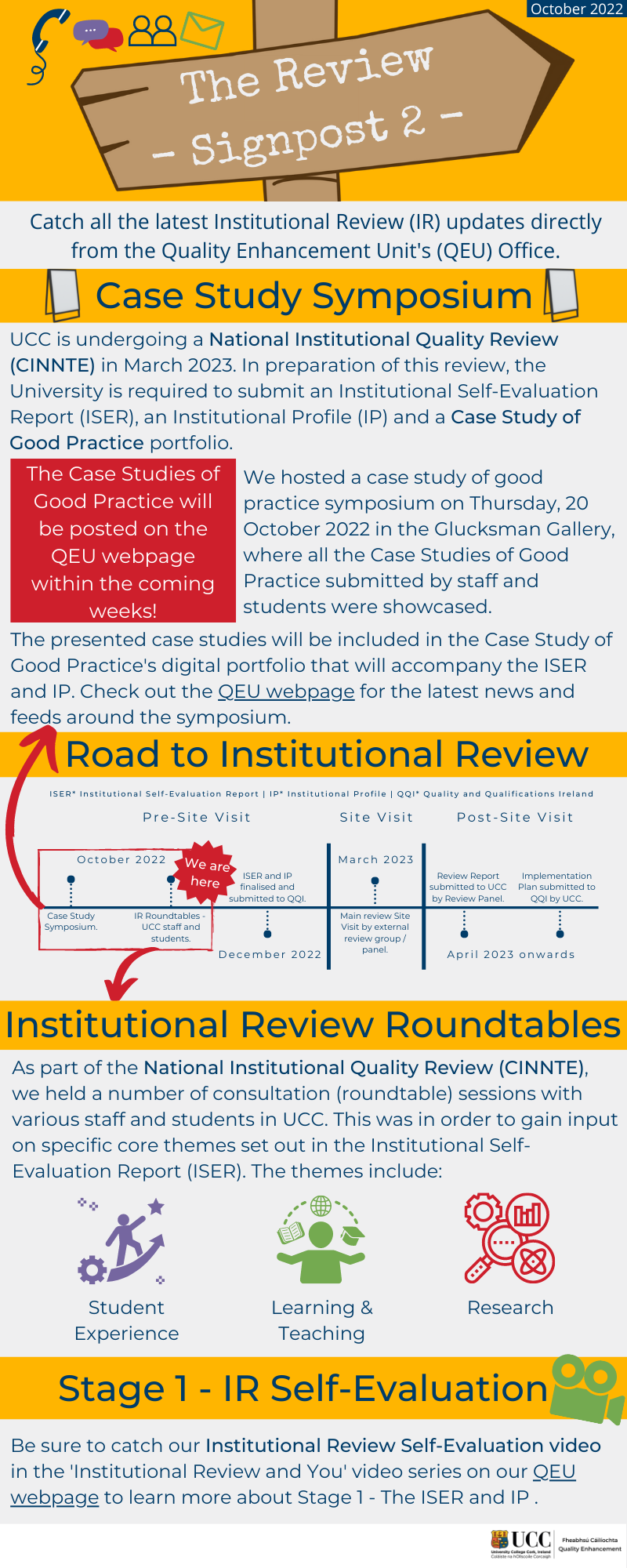 UCC is undergoing a National Institutional Quality Review (CINNTE) in March 2023. In preparation of this review, the University is required to submit an Institutional Self-Evaluation Report (ISER), an Institutional Profile (IP) and a Case Study of Good Practice portfolio. We hosted a case study of good practice symposium on Thursday, 20 October 2022 in the Glucksman Gallery, where all the Case Studies of Good Practice submitted by staff and students were showcased.