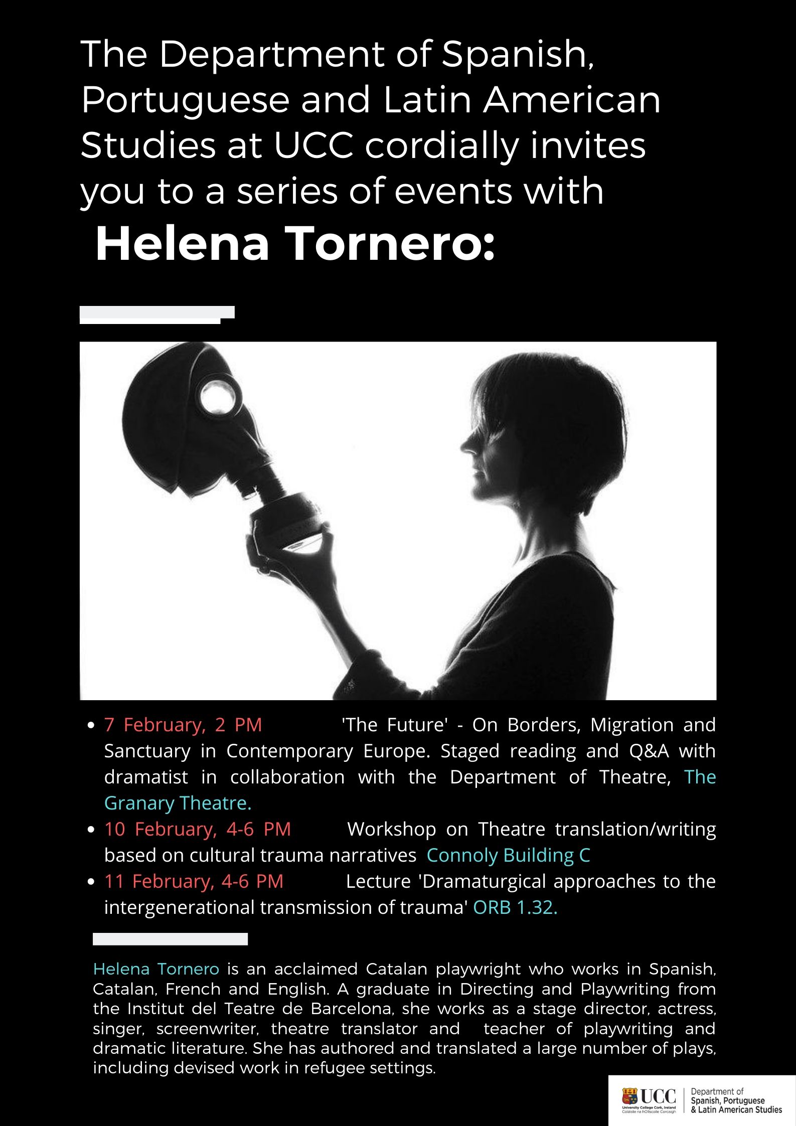 February 2020 saw a series of events with Helena Tornero, an acclaimed Catalan playwright who works in Spanish, Catalan, French and English. A graduate in Directing and Playwriting from the Institut del Teatre de Barcelona, she works as a stage director, actress, singer, screenwriter, theatre translator and teacher of playwriting and dramatic literature. She has authored and translated a large number of plays, including devised work in refugee settings.