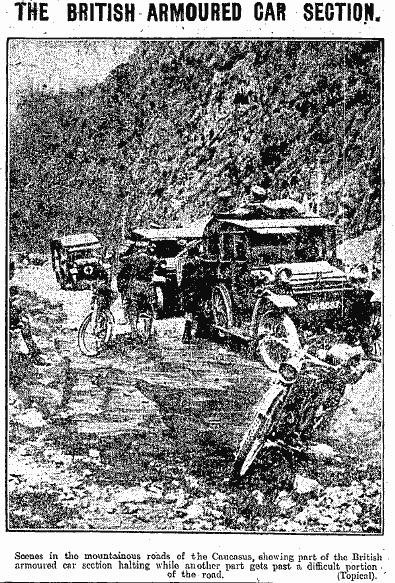 Scenes in the mountainous roads of the Caucasus showing part of the British armoured car section halting while another part gets past a difficult portion of the road.