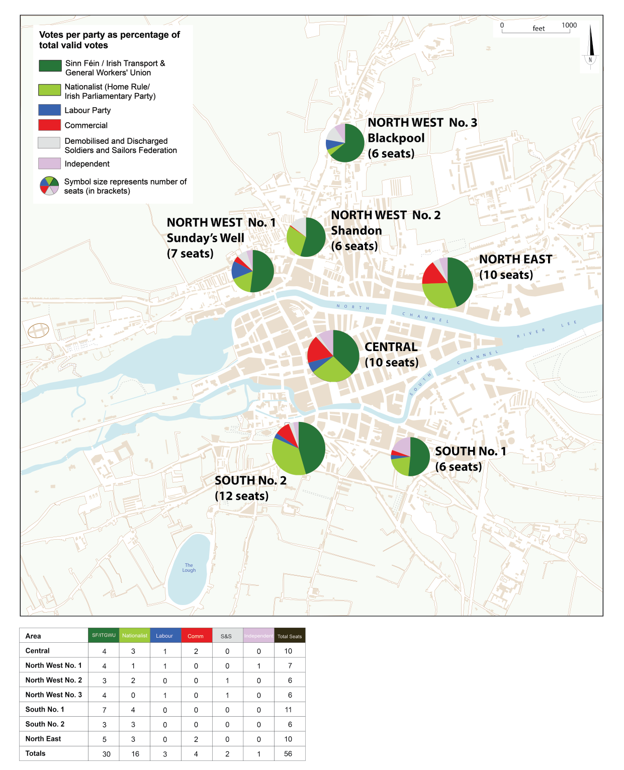 This map shows the votes per party as a percentage of the total valid votes cast in the Cork city municipal elections in January 1920.