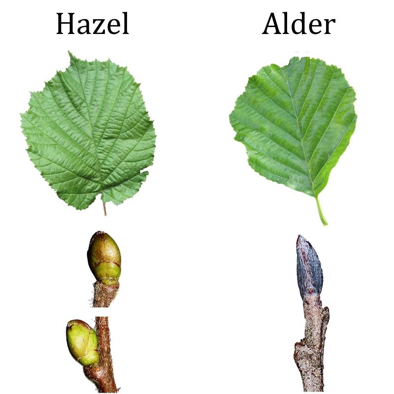 The rounded leaf shapes are similar, but hazel leaves are softly hairy compared to the shiny ones of alder.