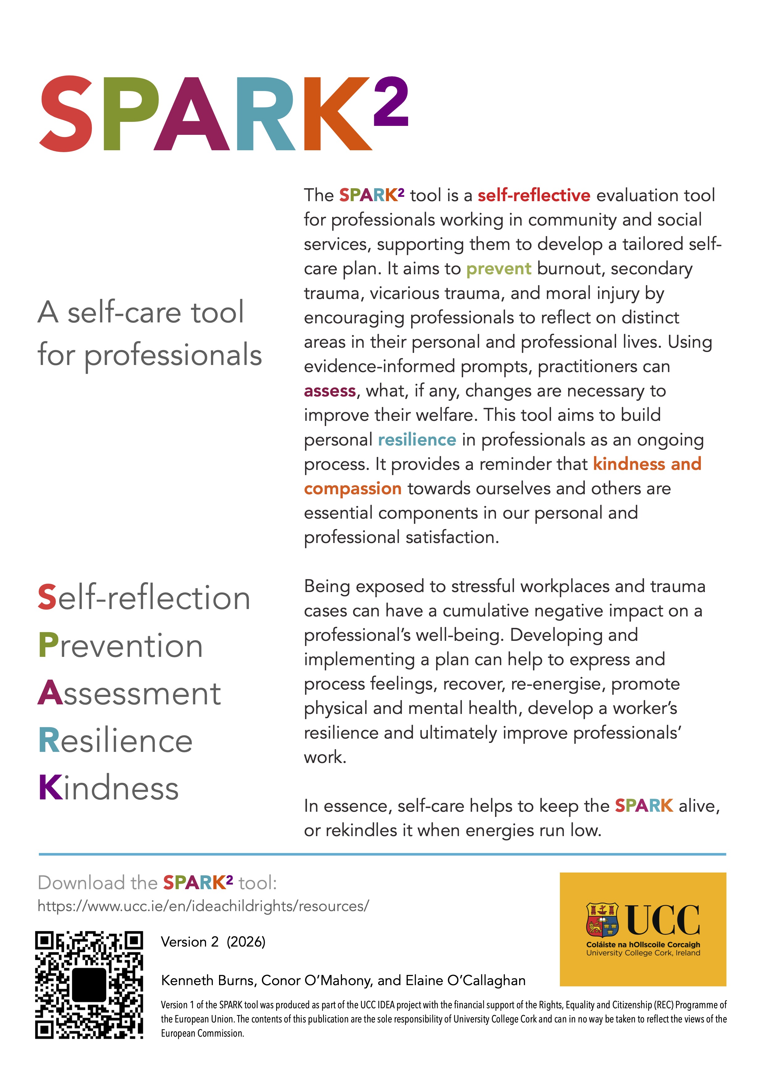 SPARK² is a free, evidence-informed self-care tool designed for professionals working in health, social care, and community services. Developed at University College Cork by Kenneth Burns, Conor O’Mahony, and Elaine O’Callaghan, the tool supports practitioners to reflect on ten key areas of their personal and professional lives — from sleep and physical health to supervision, technology use, and emotional wellbeing.