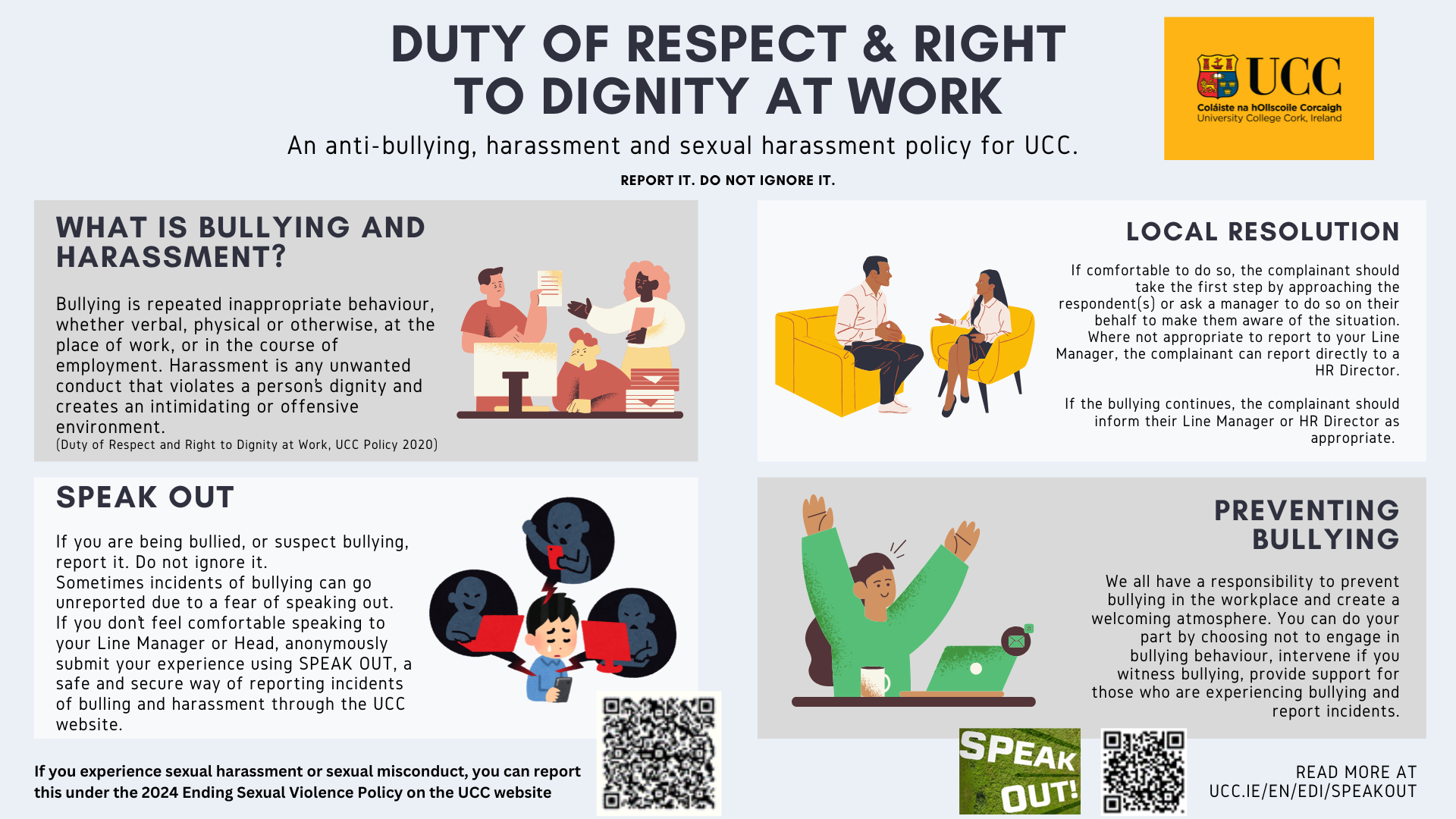 The EDI committee have created an infographic poster to inform you about the UCC Duty of Respect and Right to Dignity at Work policy.
