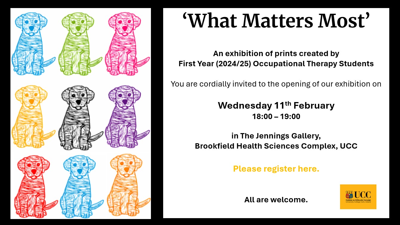 The School of Clinical Therapies is delighted to announce the opening of “What Matters Most,” an exhibition of prints created by First Year (2024/25) Occupational Therapy students.