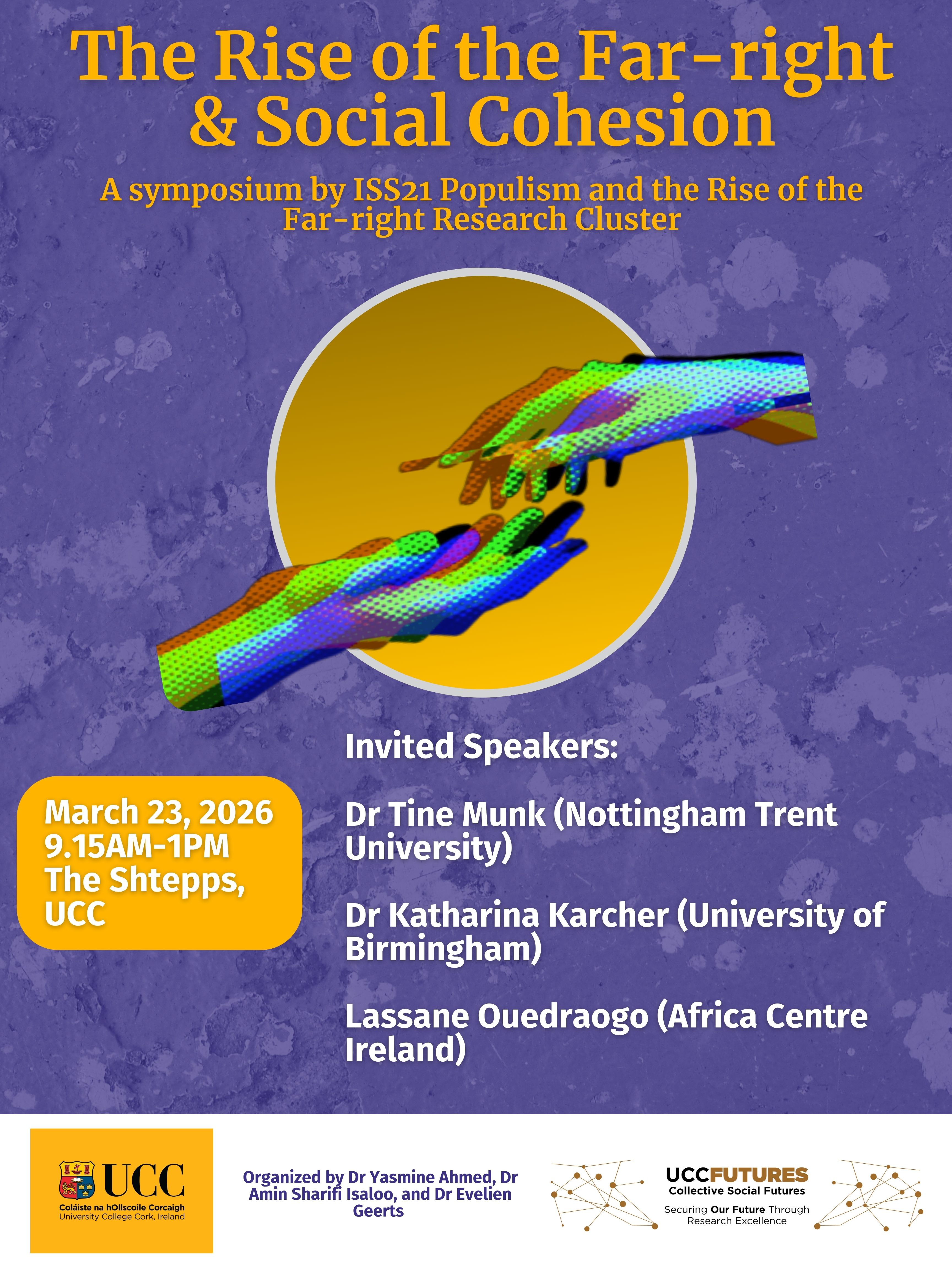 - Lassane Ouedraogo (Africa Centre Ireland) “The Rise of the Far-right in Ireland and Europe: Implications for Social Cohesion”. With a response by Dr Yasmine Ahmed (UCC). Chaired by Dr Dyuti Chakravarty (UCC).