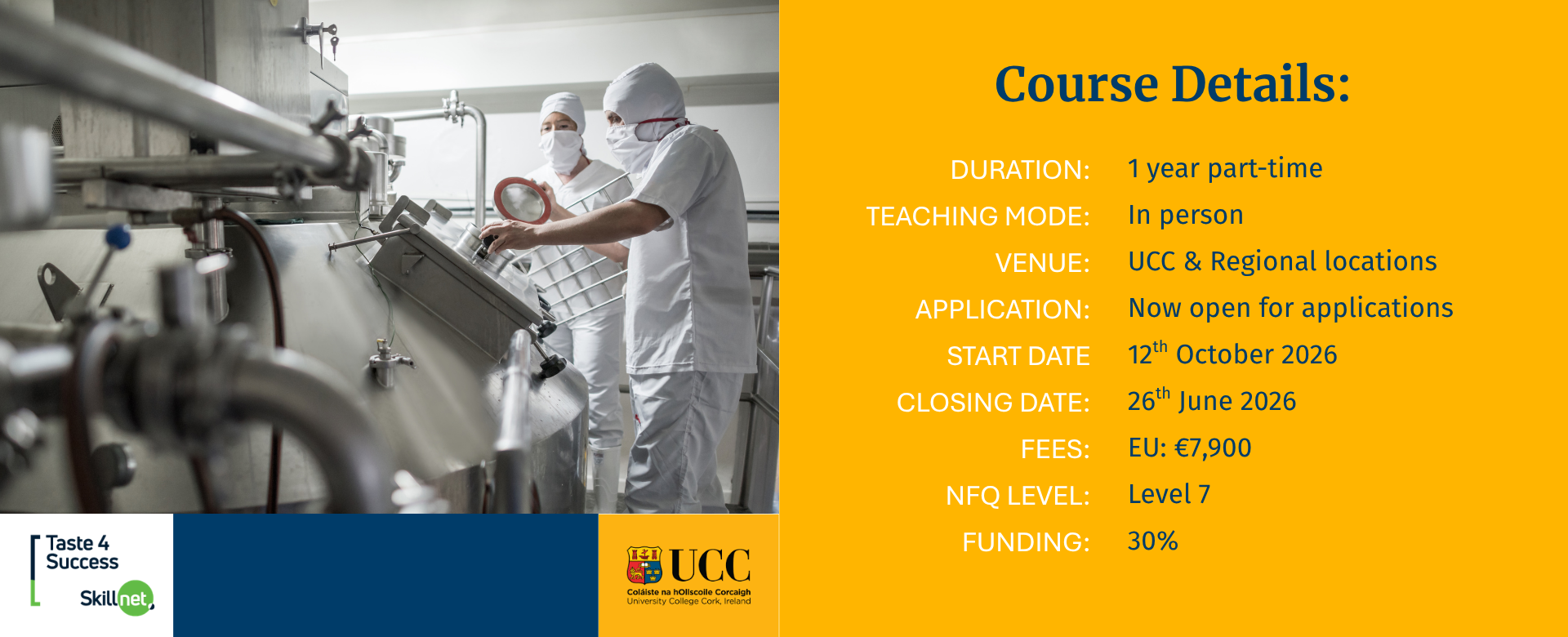 The Diploma in Food Manufacturing Management is a part-time, Level 7 qualification for professionals in the food and beverage sector. Funding of up to 40% may be available through Taste 4 Success Skillnet for eligible applicants.
