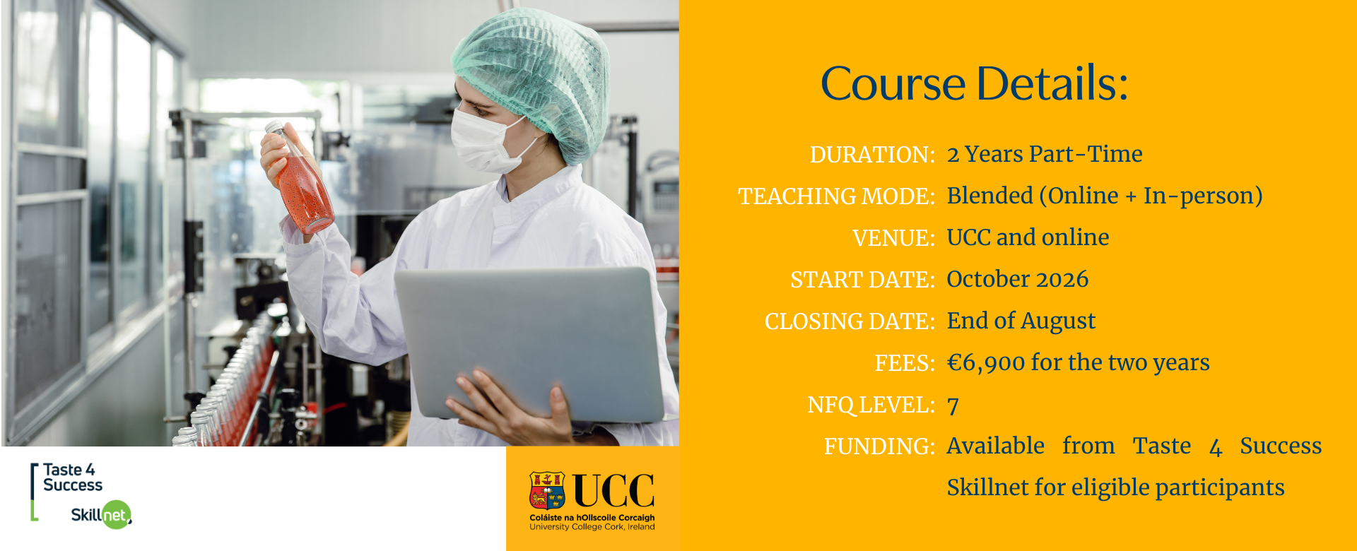 The team at UCC deliver a professional course and manageable timeline for anyone in full time employment with exceptional course material and support mechanisms from all lecturers. Anyone looking for a part time course to expand their knowledge or enter into Food Science and Technology then look no further.