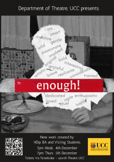 The UCC Department of Theatre would like to invite you to 'enough!' - Two evenings sharing new work created by HDip, BA and visiting students as part of DR2027 supported by DR3009 production students.