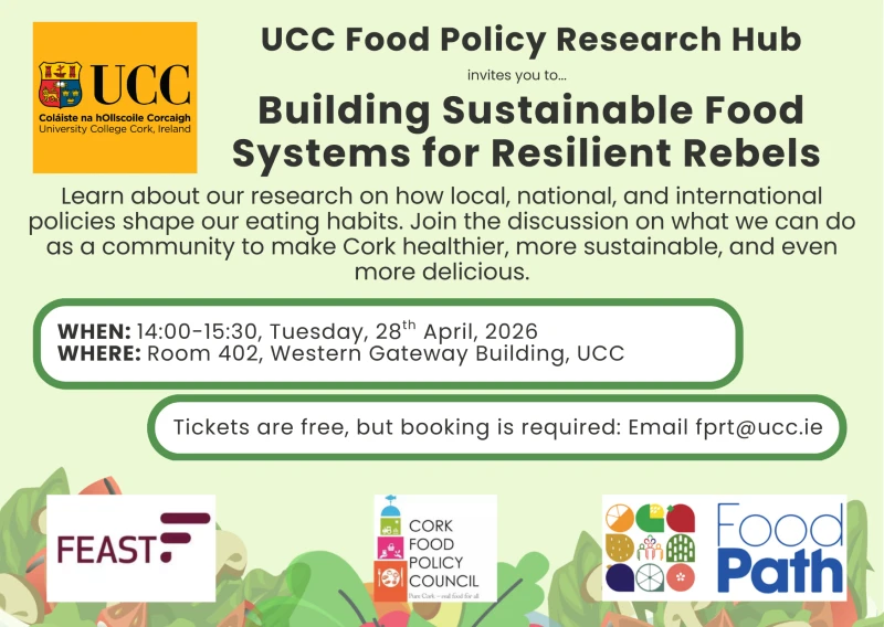 Join the UCC Food Policy Research Team on Tuesday, 28th April at 2pm (Room 402, 4th Floor, Western Gateway Building) as we dive into “Building Sustainable Food Systems for Resilient Rebels.” Let’s spark ideas and shape a better food future together!