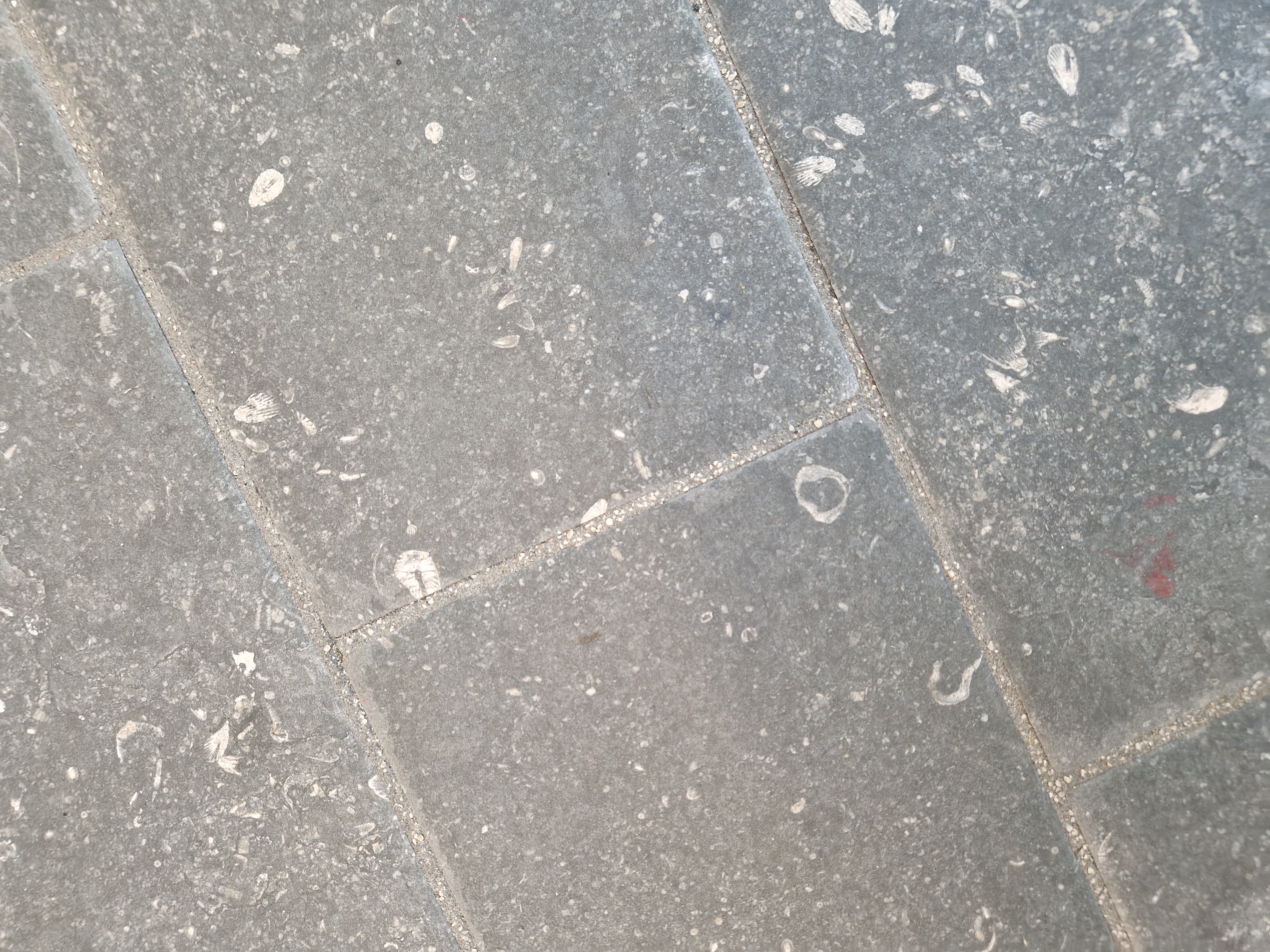 - The dark grey limestone in the foyer is very fossiliferous, with abundant small corals, rare brachiopods