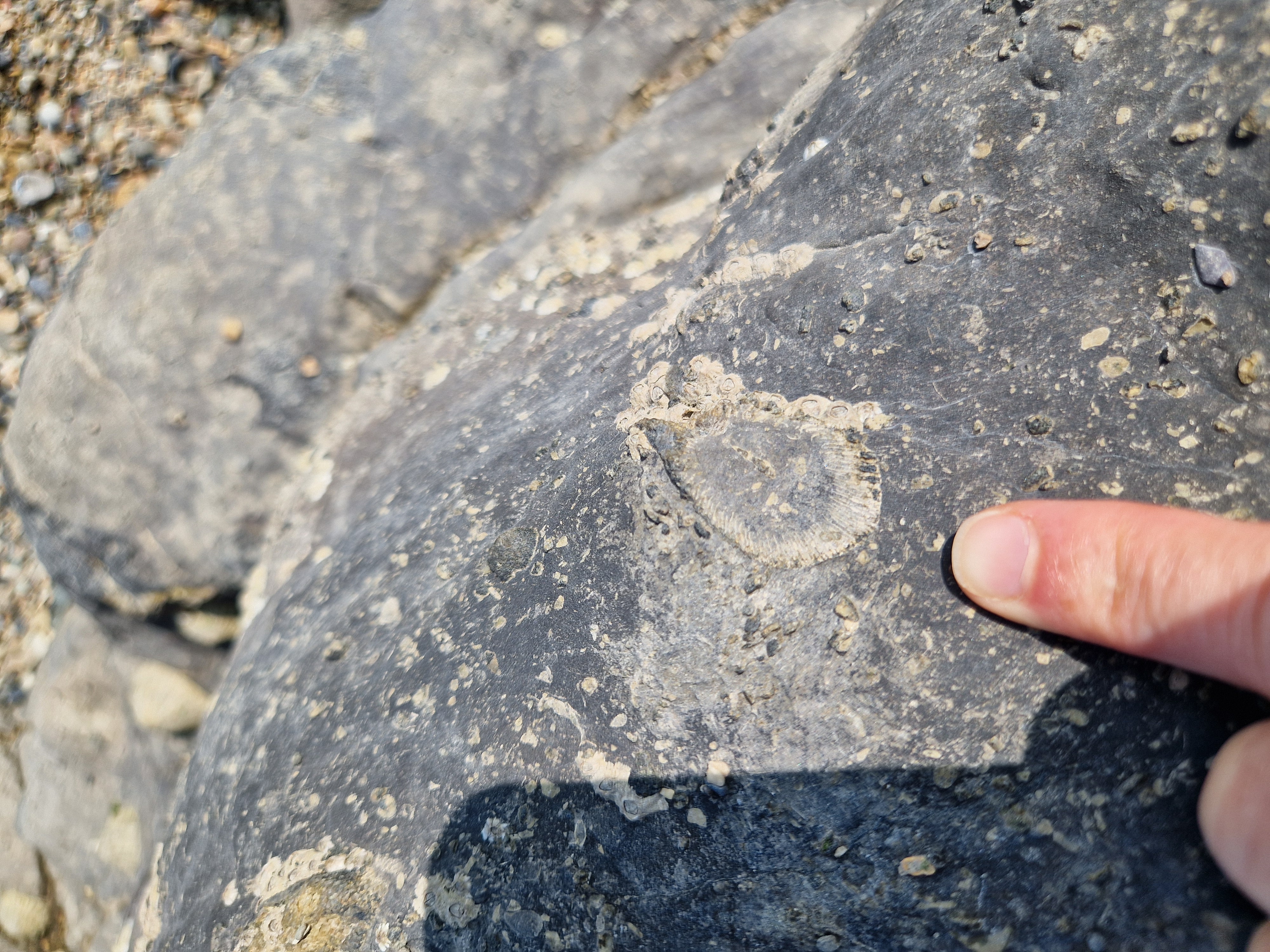 - The low rocks on the north side of the bay are fossiliferous limestone. There are abundant crinoid ossicles, with rare solitary corals and brachiopods. The fossils are slightly raised as they are partially replaced by silica.