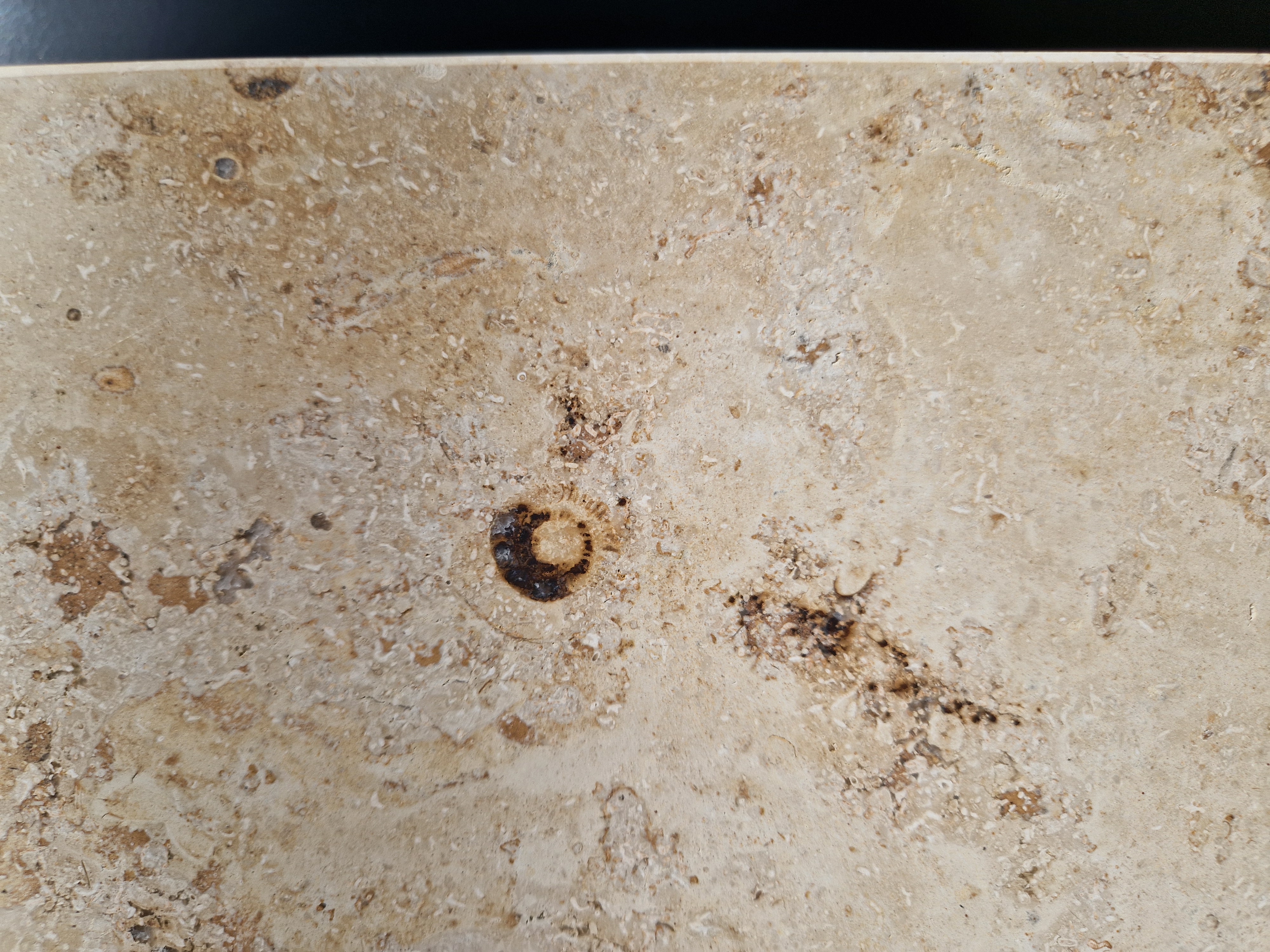 - The cream-coloured limestone contains an excellent example of a belemnite, sponges and some ammonites.
