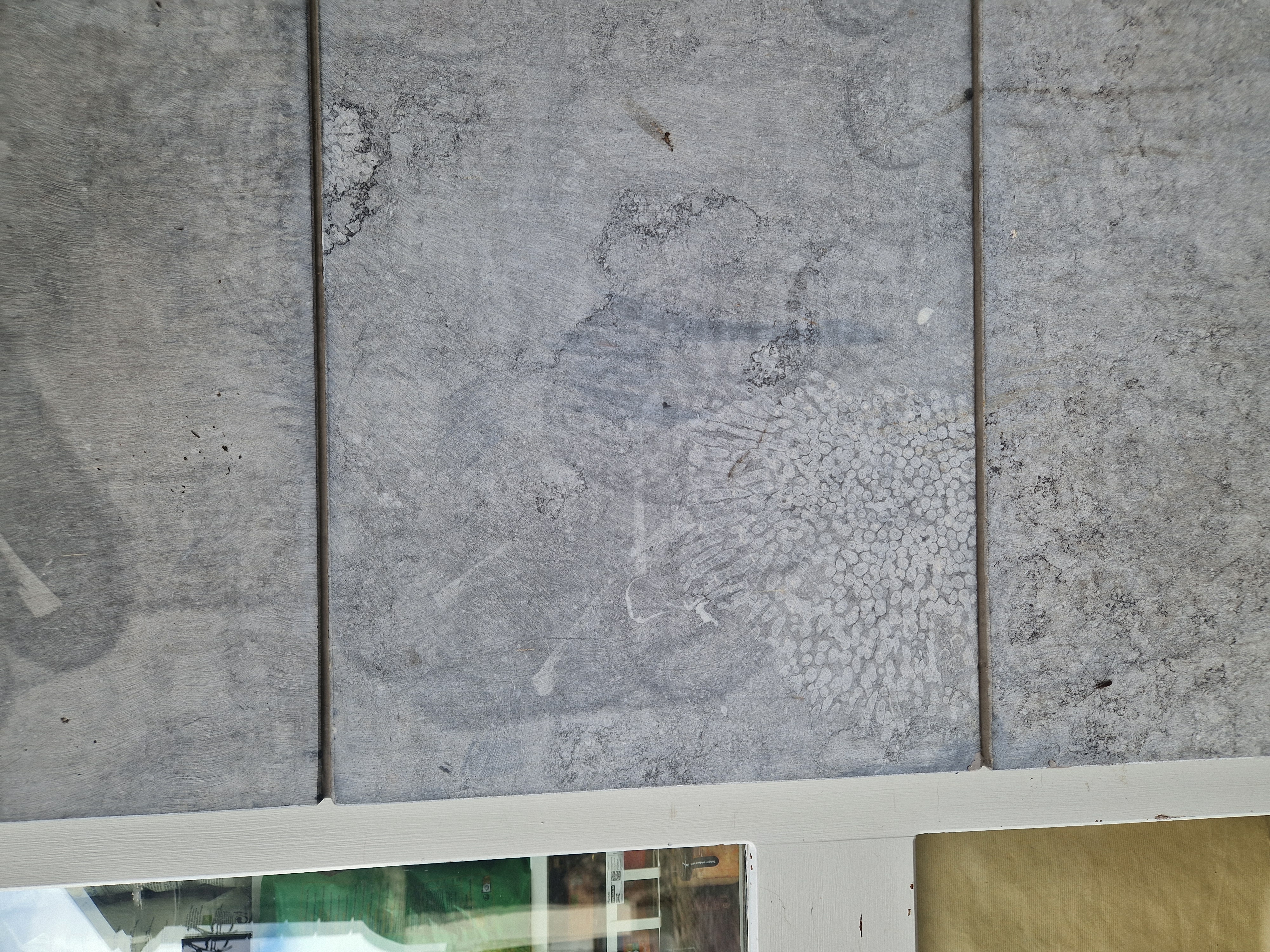 - The grey limestone of the shopfront and adjacent pillars contains abundant cross-sections through crinoids, with some colonial corals.