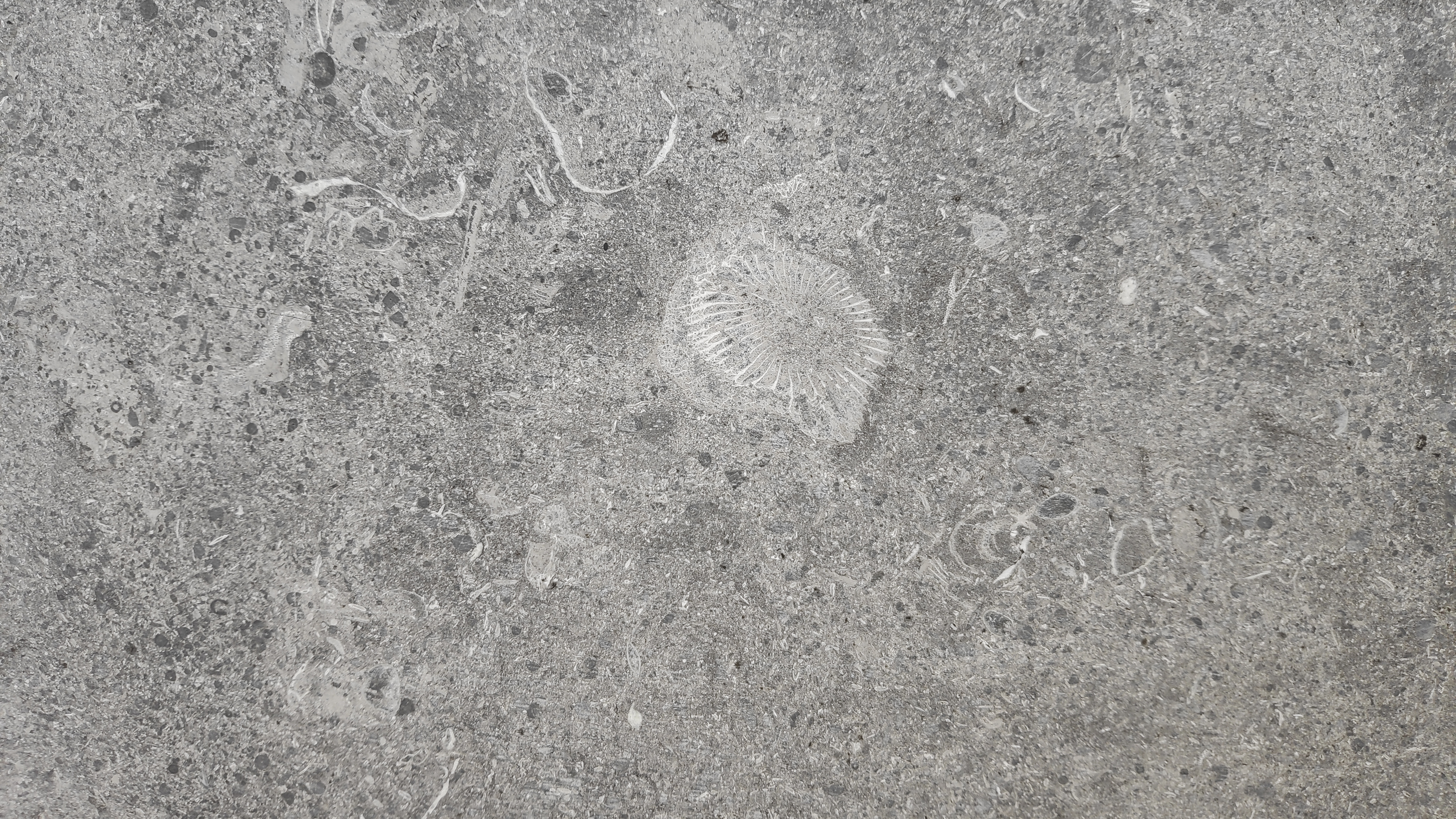 - The abundant crinoid ossicles appear as white and light-grey circles, columnal crinoid stem segments, preserved in cross-section, appear as rectangles with lateral divisions. Solitary corals and brachiopods can also be seen here.