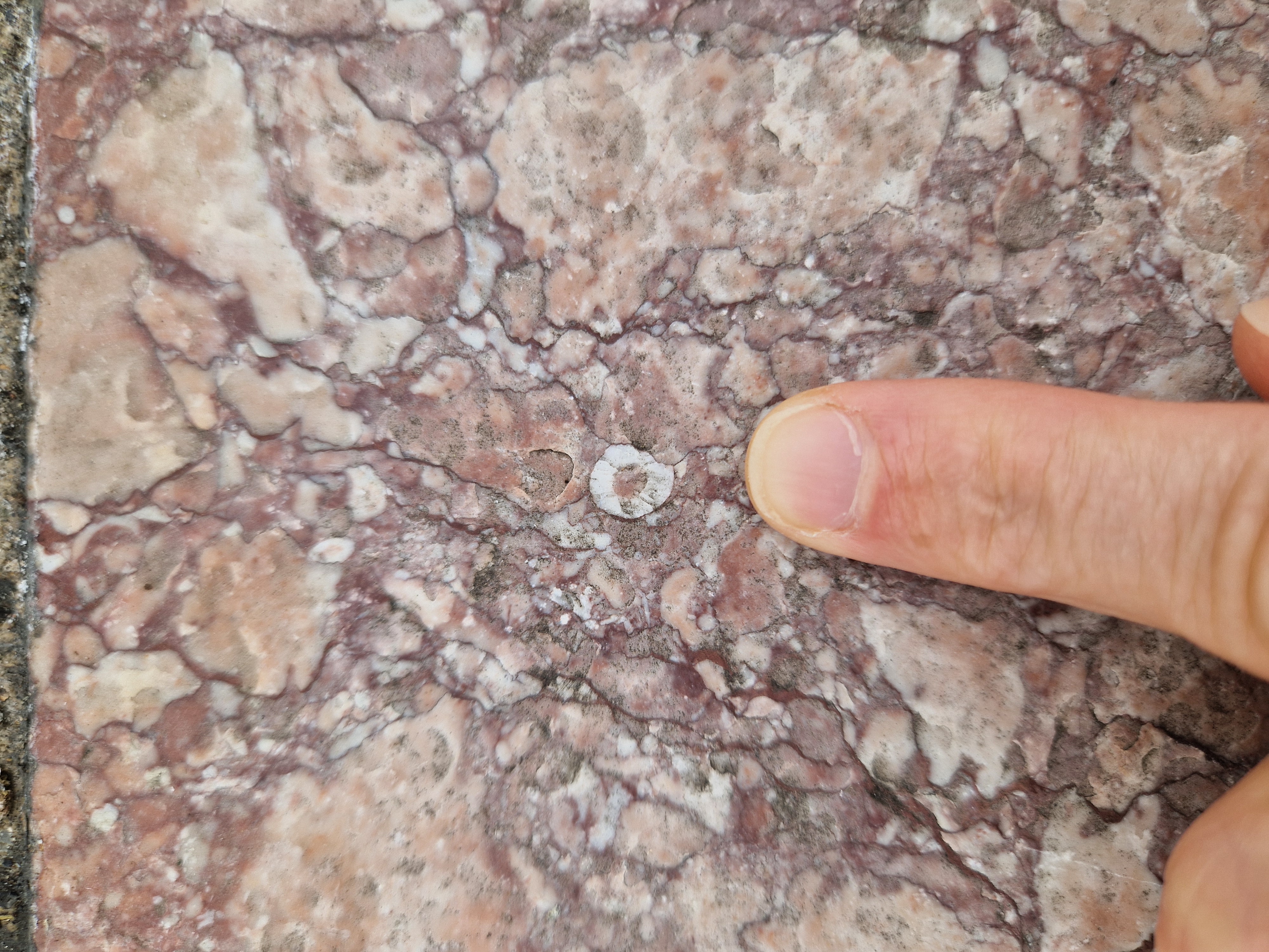 - The stone and angel figures carved into the grey limestone contain spectacular fossils. The limestone is extremely rich in crinoid ossicles, brachiopods and corals. The red paving stones nearby are Cork Red Marble, which contains rare to common crinoid ossicles.