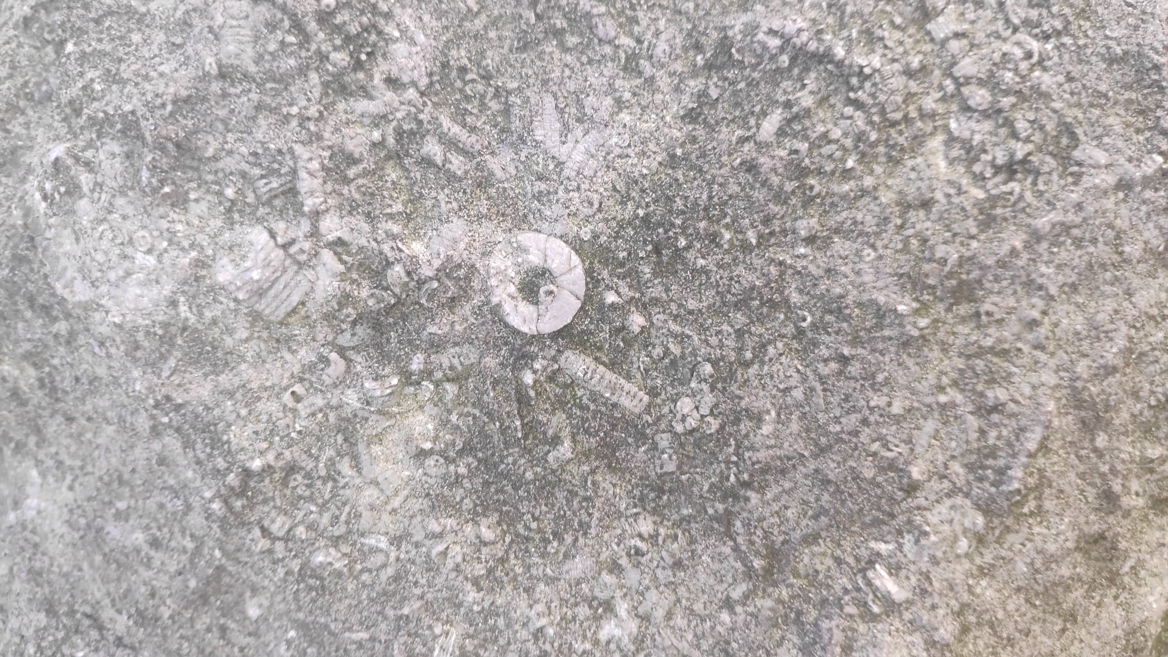 Abundant crinoid ossicles appear as white and light-grey circles. Fossils of bryozoa resemble a fine lace or net-like branching pattern can also be found here.