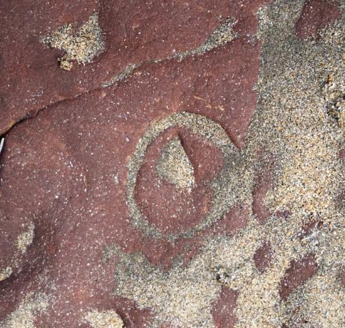 These are fossil burrows that are circular in shape in plan view. These burrows were made by extinct crustaceans (similar to horseshoe crabs) that lived close to river channels. The crustaceans made the burrows as they tried to escape from sand laid down during floods – we call these “escape structures” The burrows were later infilled with more (slightly darker) sand, helping us to recognise them in the rocks as we see them today.