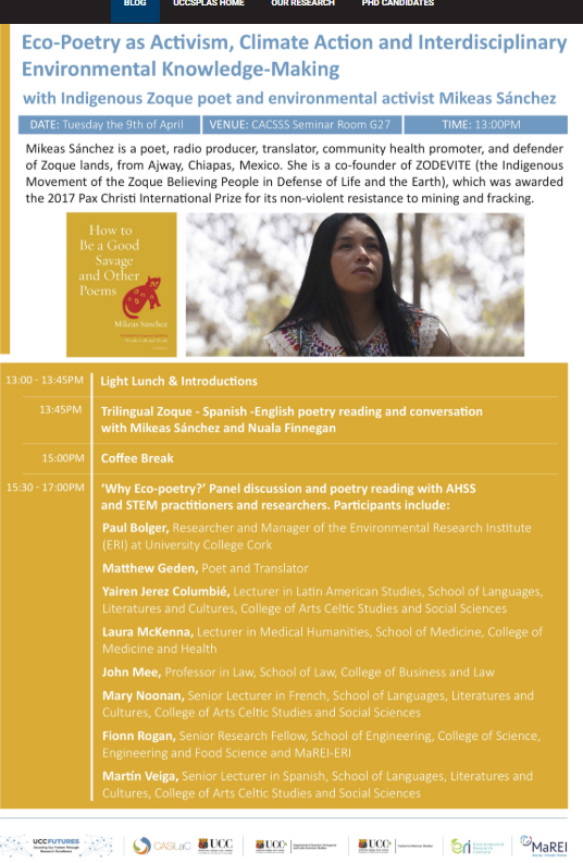 Veiga participou como poñente no simposio ‘Eco-poetry as Activism, Climate Action and Interdisciplinary Environmental Knowledge-Making’, celebrado na UCC, co relatorio titulado ‘Thinking Poetry Ecocritically’.