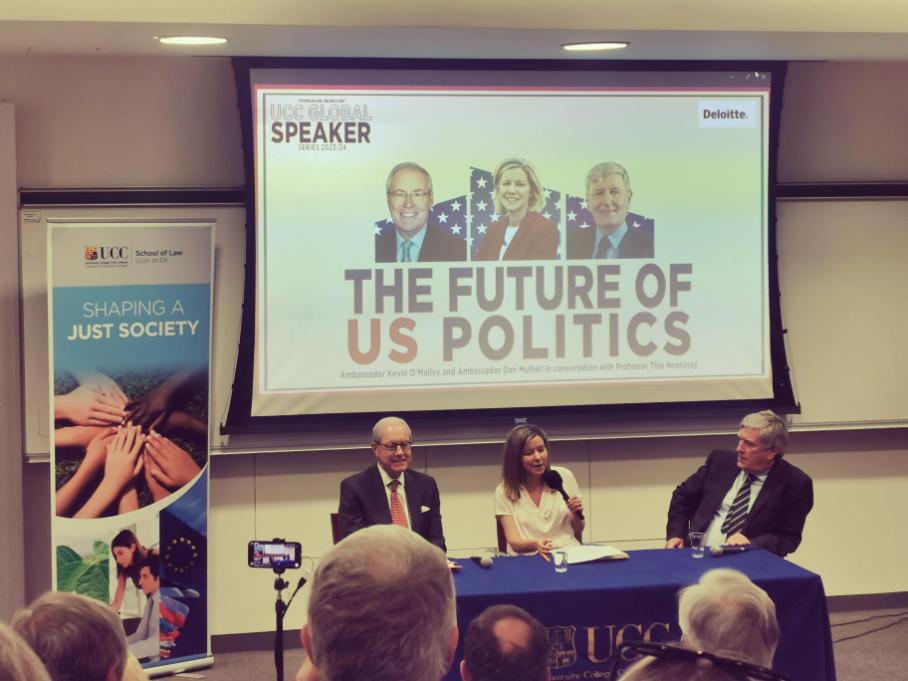 March 2024 – The Future of US Politics Ambassadors Kevin O’Malley and Dan Mulhall took part in a discussion on ‘The Future of US Politics’, as part of Alumni & Development’s ‘Global Speaker Series’ on Wednesday, 20th March. Chaired by Professor Thia Hennessy, the conversation touched on a range of topics including the significance of US politics internationally, the close connections between the US and Ireland and the current political climate in the US.