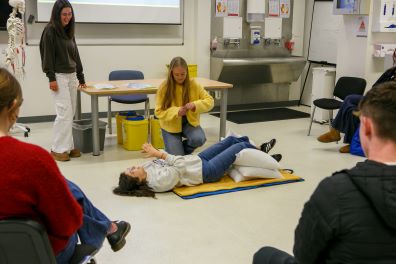 Following a warm welcome by Prof Paula O’Leary, Dean of the School of Medicine, and Mr Simon Smith, School of Medicine Prep-for-Med organiser, the one hundred TY students and their Guidance Counsellors spent the morning in Brookfield Health Sciences Complex. They were given a tour of the state-of-the-art FLAME anatomy lab and the teaching facilities in Brookfield including clinical skills rooms and the ASSERT centre. The TY students themselves were given ‘hands on’ experience of how clinical skills are taught in the medical programme. Facilitated by our fantastic volunteer medical students and supervised by faculty, including Dr Rob Gaffney, Dr Nora McCarthy, Dr Irina Korotchikova and Dr Fiona Quinn, they were given the opportunity to practice skills such as measurement of vital signs, as well as emergency management of cardiac arrest, anaphylactic shock and acute haemorrhage. In parallel, talks were delivered to the Guidance Counsellors by Dr Helen Hynes, Direct Entry to Medicine Programme Director and Senior Lecturer in the Medical Education Unit, about the Medical Programme in UCC and by Mr Dave O’Sullivan, from Student Support, about the transition to university.