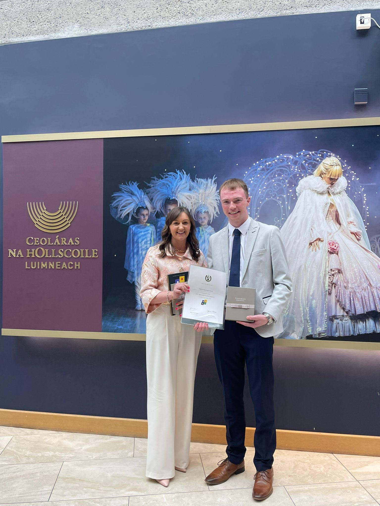 (L-R) Karen Blennerhassett (Príomhoide, Meán Scoil Nua an Leith Triúigh) and Patrick Harrington-Stack (BPharm1) at the All-Ireland Scholarships 2025 awards ceremony in UL