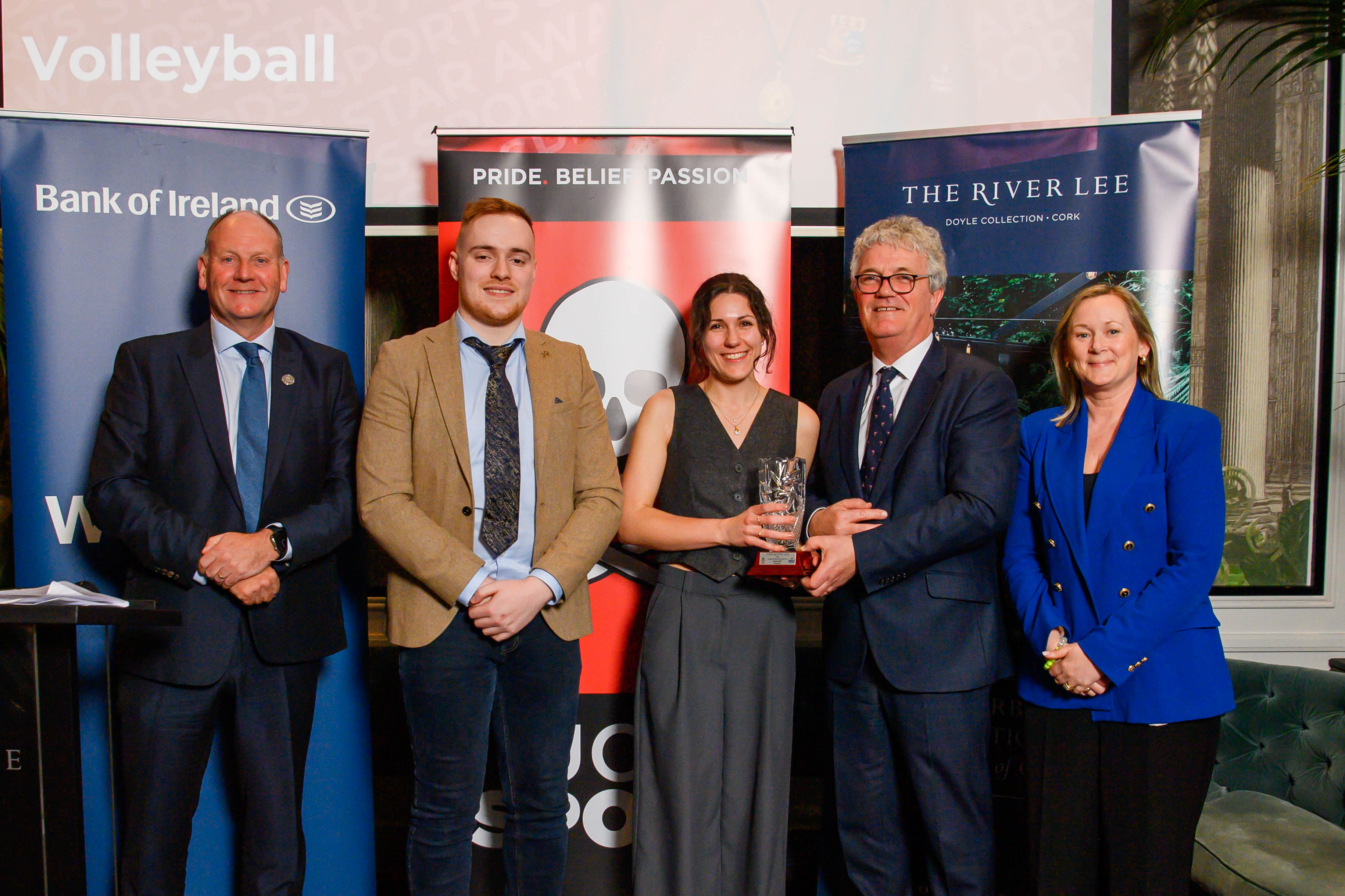 Morgan Buckley, UCC Head of Sport and Physical Activity, James Towey, Bank of Ireland, Lisa Lonetti, Volleyball Coach, Professor John O'Halloran President of UCC, Claire Myler, River Lee Hotel