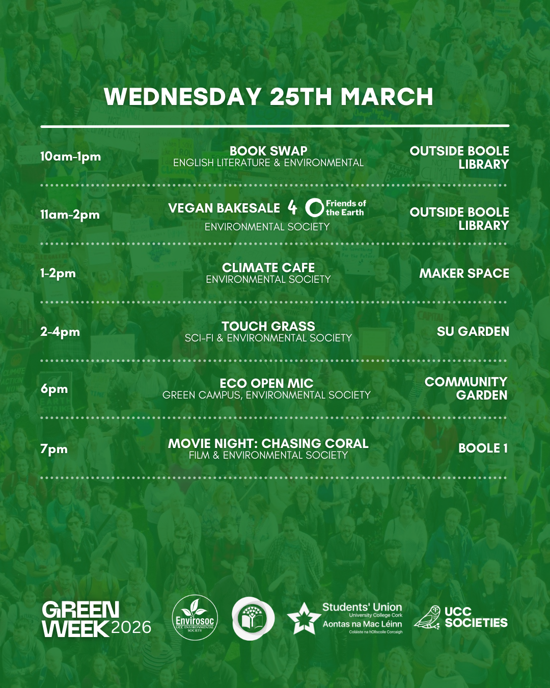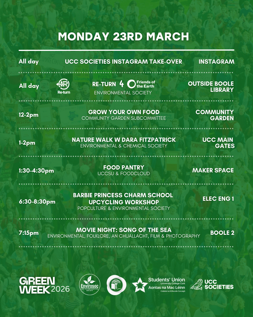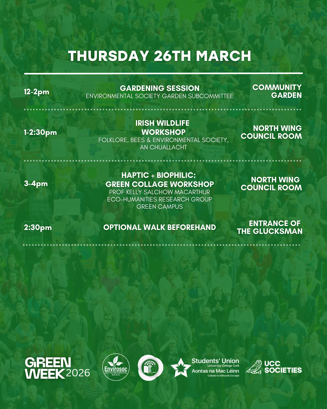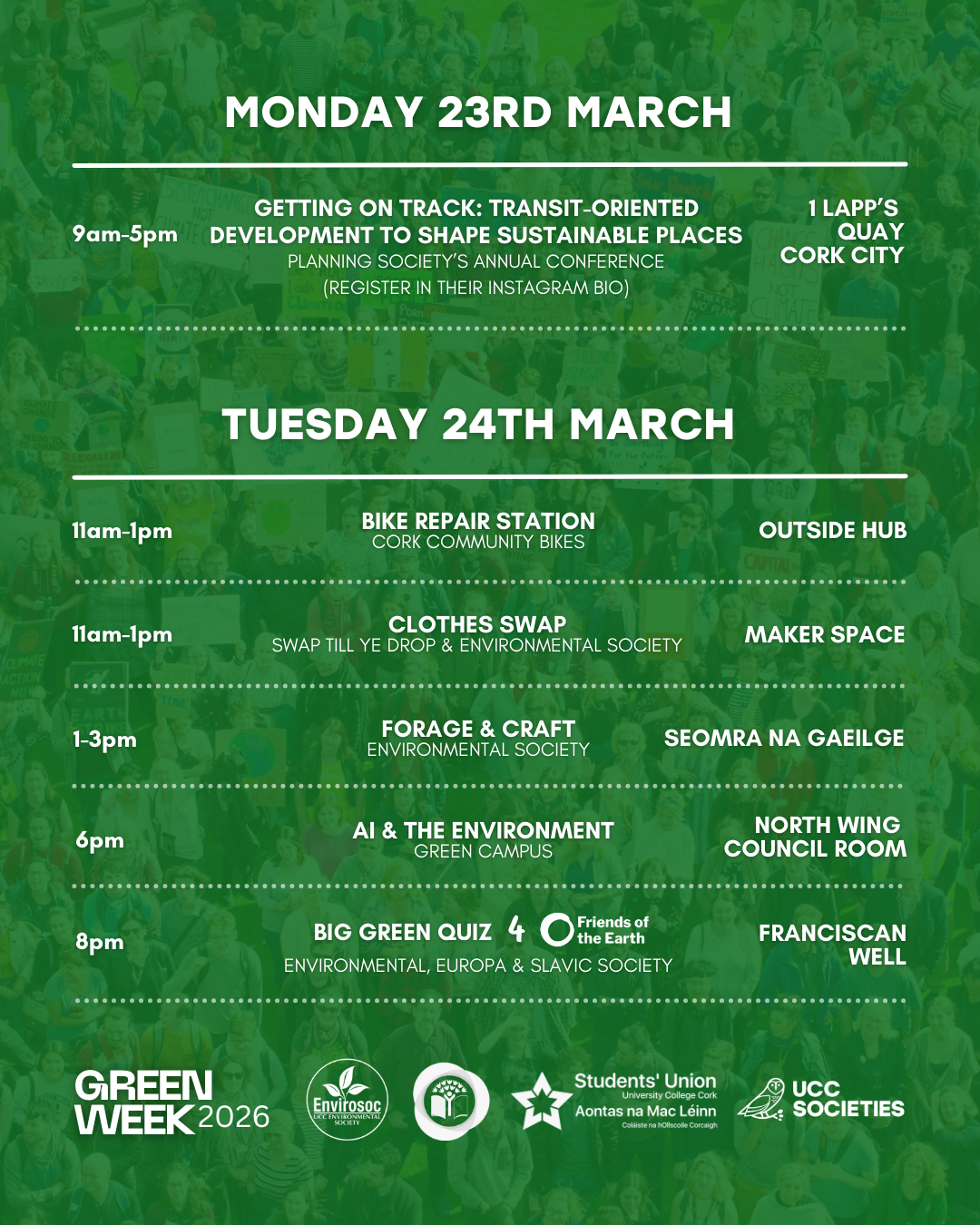 UCC Green Week 2026 brings together a series of events, workshops, and activities focused on sustainability, climate action, and environmental awareness. Starting on Monday, 23 March and taking place throughout the week, the programme offers staff, students, and the wider community opportunities to learn, share ideas, and get involved in practical initiatives that support a more sustainable future. From expert talks and interactive workshops to campus activities and community engagement, Green Week highlights the collective efforts being made to promote environmental responsibility and inspire positive change.