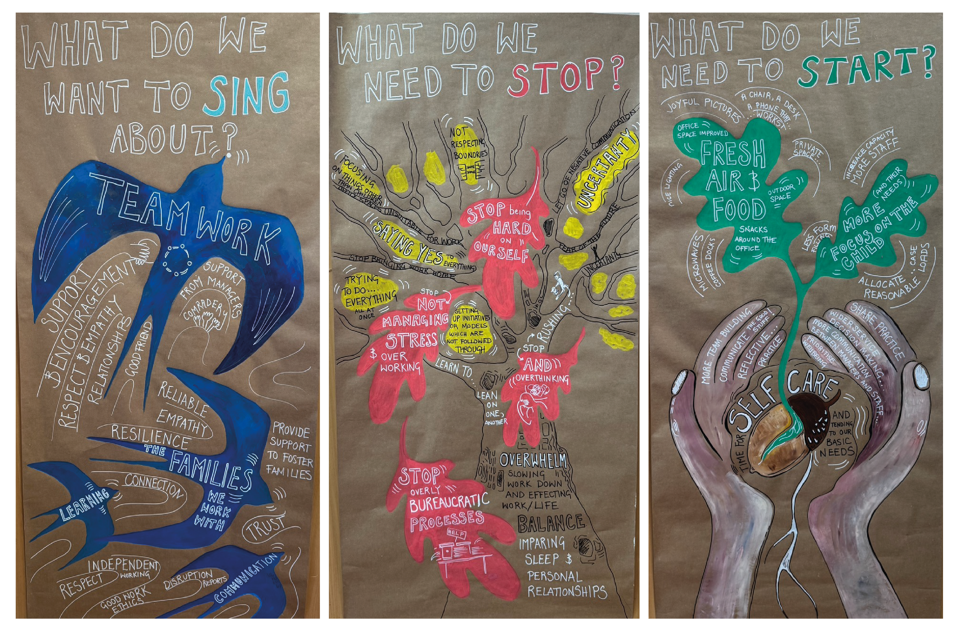 As part of the Practice Initiatives Showcase Event were three reflective, participatory exercises with attendees that invited practitioners to collectively explore what is sustaining their work, what may be holding them back, and what new practices are needed to move forward. Using accessible visual metaphors and creative reflection, participants were asked to consider: what they want to continue (“what is working and what do we want to sing about?”), what they need to stop (“what is no longer serving us”), and what they want to start (“what seeds should we plant next?”). These reflections captured key themes across teamwork, leadership, systems, and wellbeing, highlighting the strong relational foundations already present, the pressures created by workload and bureaucracy, and the shared desire to invest in environments, practices, and supports that enable trauma-informed work to flourish. The exercise created a reflective bridge between individual experience and system-level change, reinforcing the TARA Project’s commitment to co-creation, practitioner voice, and embedding trauma-informed principles in everyday practice.